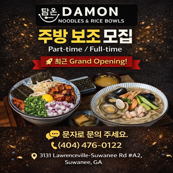 최근 Suwanee에 새롭게 오픈한 Damon 담온 – Noodles & Rice Bowls 에서 함께 성장할 주방 보조 직원을 모집합니다. > 구인/구직
