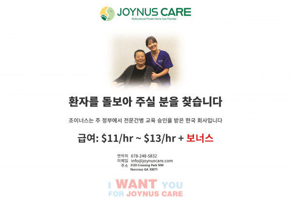 구인 조이너스 케어에서 남, 여 간병인을 구합니다