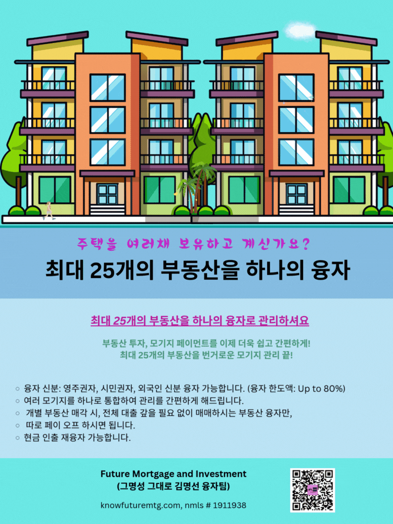 최대 25개의 부동산을 하나의 융자로 관리하세요 번거로운 모기지 관리 끝!