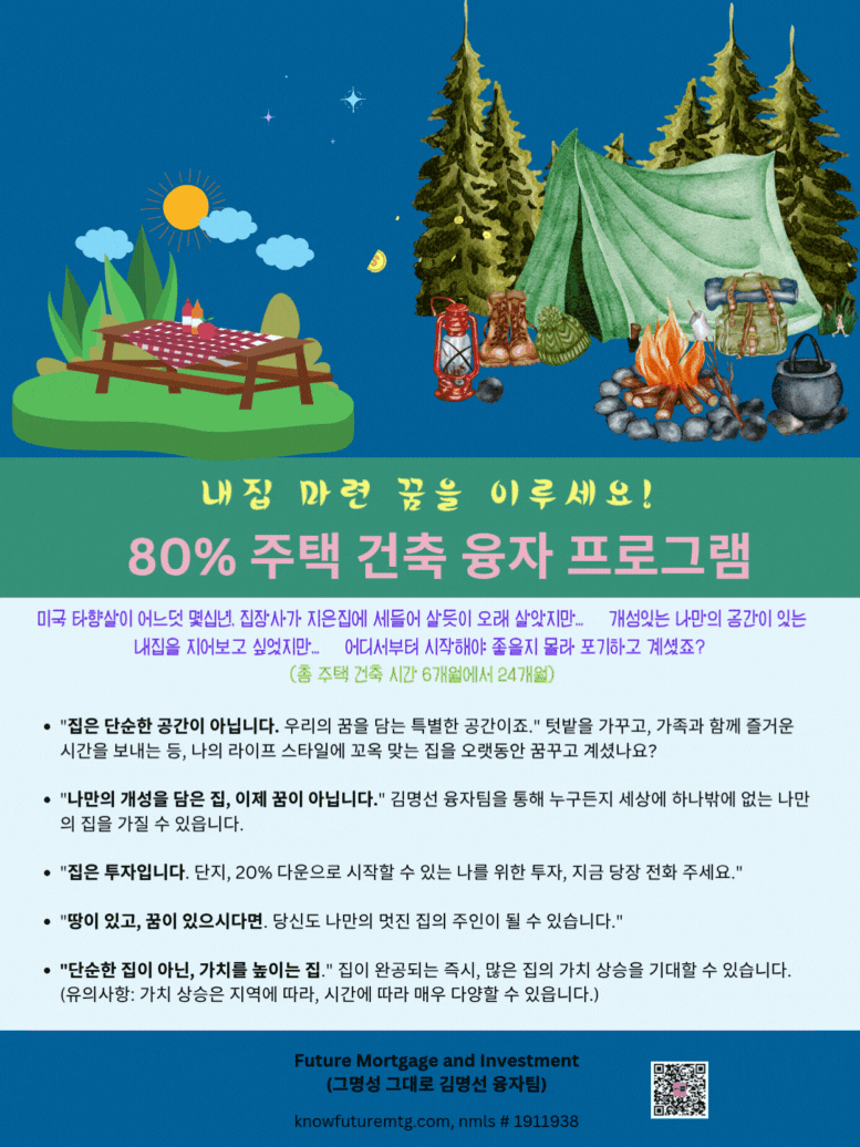 주의 사항: 융자는 돈 (신용)이고 돈 (신용) 은 빚입니다. 융자를 잘 활용하면 자산 증식이나 경제 생활에 큰 이익을 주지만, 그렇지 못할 경우, 집을 잃거나 경제적인 파국의 원인이 될수 있읍니다. 육체적인 고통이나 정신적인 고통은 911을 누르시고, 채무로 인한 경제적인 고통은 CFPB, Financial Counselor 혹은 가까운 융자 전문가에게 문의 하셔요.