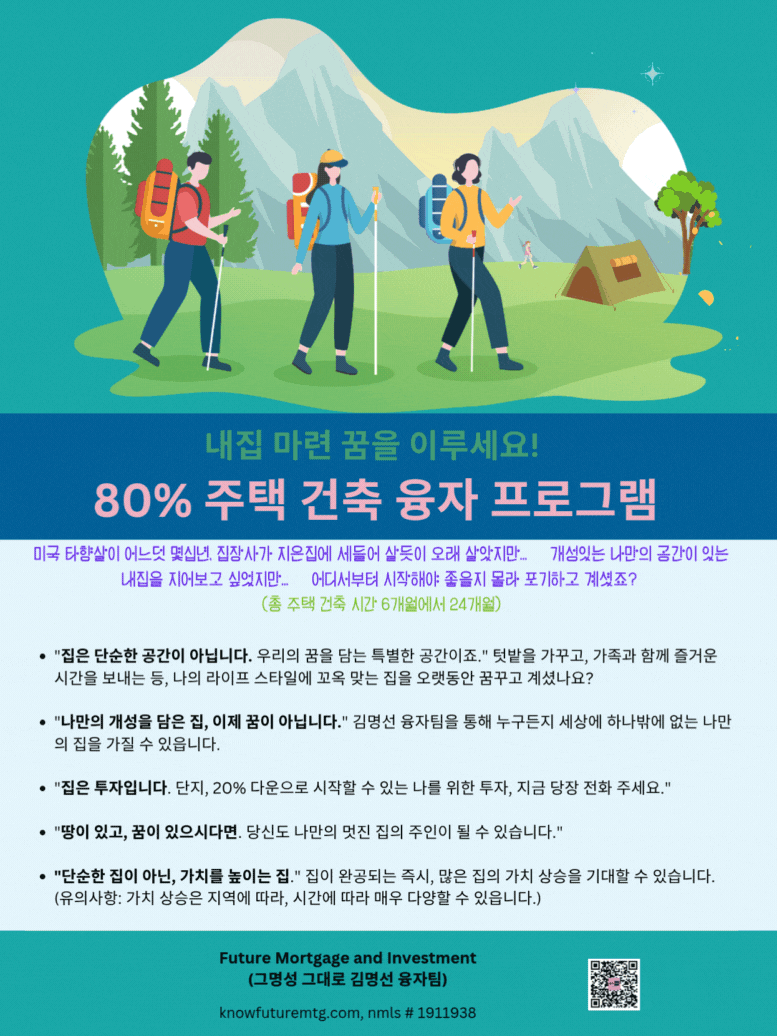 주의 사항: 융자는 돈 (신용)이고 돈 (신용) 은 빚입니다. 융자를 잘 활용하면 자산 증식이나 경제 생활에 큰 이익을 주지만, 그렇지 못할 경우, 집을 잃거나 경제적인 파국의 원인이 될수 있읍니다. 육체적인 고통이나 정신적인 고통은 911을 누르시고, 채무로 인한 경제적인 고통은 CFPB, Financial Counselor 혹은 가까운 융자 전문가에게 문의 하셔요.