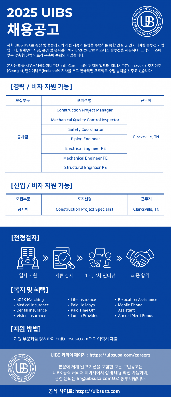 구인 (UIBS) 대규모 채용 (건설 및 엔지니어링) - 비자지원 가능