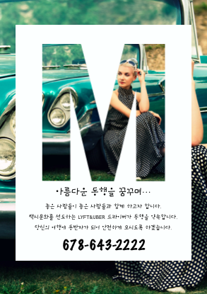 구인 UBER/LYFT 동우회에서 공항과 타운에서 모시고 있습니다. 678-643-2222