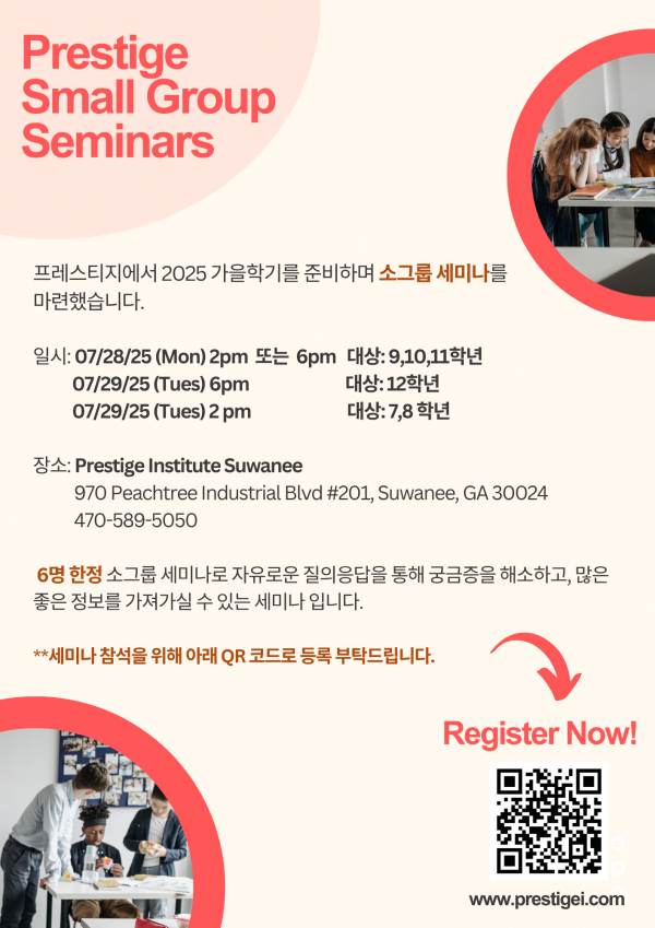 Prestige 학원에서 진행하는 소그룹 세미나에 참여하여 맞춤형 지도와 궁금한 점들을 해결해보세요!