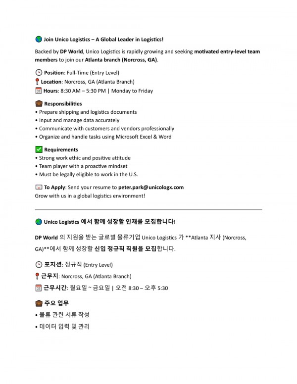 구인 운송회사에서 Logistics Operation 업무 직원 구합니다
