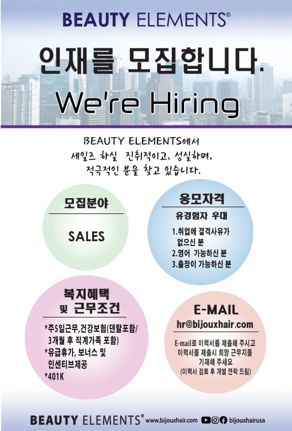 머리도매회사에서 세일즈 하실분 모십니다. ( 경력자 우대함)