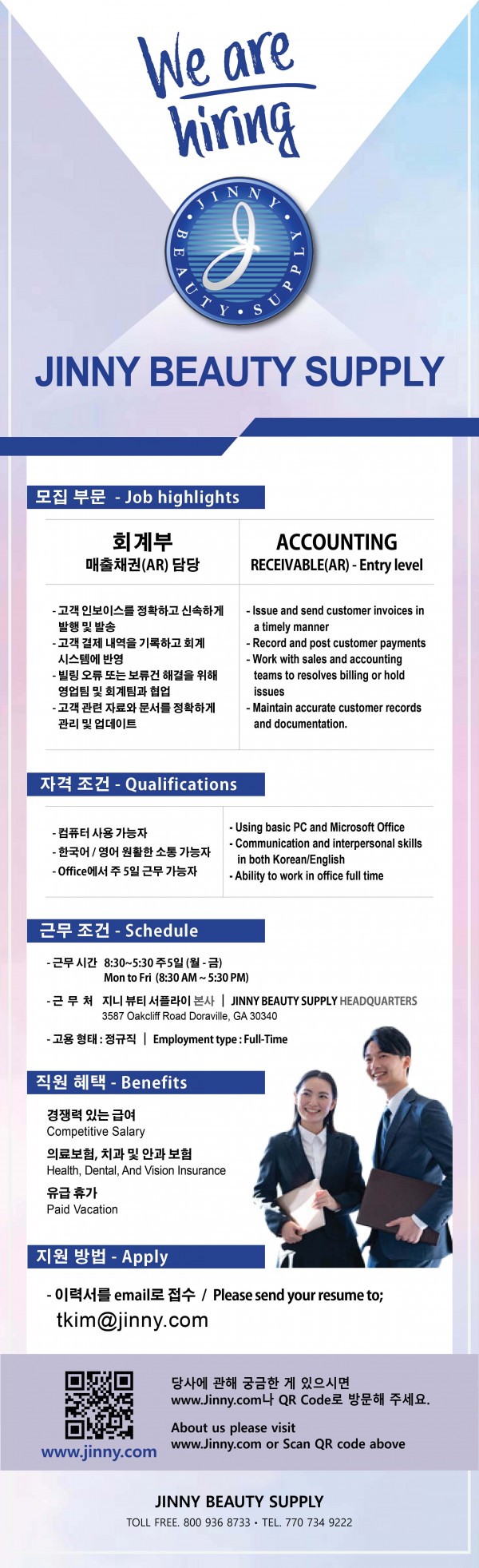 jinny Accounting에서 함께 일하실 직원을 구합니다.
