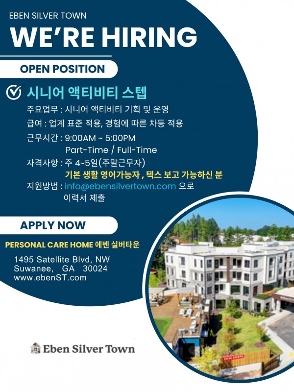 스와니 에벤실버타운에서 시니어 액티비티 스텝을모집합니다.