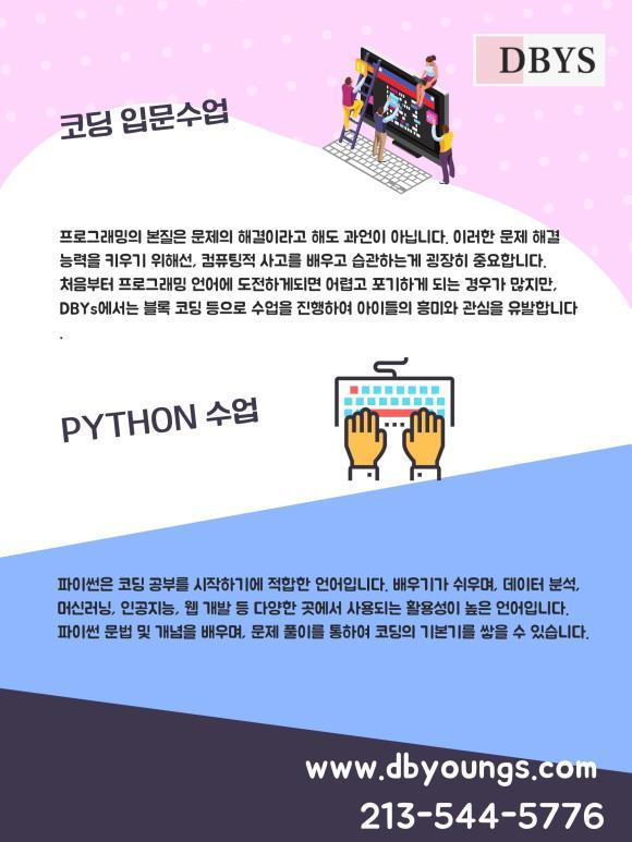 쉽고 재밌게 배우는 Python! 저희 DBYs에서는 Georgia Tech 석사, 현직 개발자 등이 모여서 효율적으로 공부 할 수 있는 Python 수업 커리큘럼을 만들었습니다. 기본 문법, 문제 풀이 등 기본적인 Python 공부는 물론이며, 내가 쓴 코드를 실제로 현실에 적용하여, 어떻게 코딩이 사용이 되는지 등 막연히 공부만 하는 것이 아닌 응용하여 실생활에 적용하는 것까지 전문가 선생님들과 함께 배웁니다.