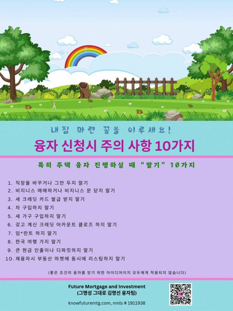 주의 사항: 융자는 돈 (신용)이고 돈 (신용) 은 빚입니다. 융자를 잘 활용하면 자산 증식이나 경제 생활에 큰 이익을 주지만, 그렇지 못할 경우, 집을 잃거나 경제적인 파국의 원인이 될수 있읍니다. 육체적인 고통이나 정신적인 고통은 911을 누르시고, 채무로 인한 경제적인 고통은 CFPB, Financial Counselor 혹은 가까운 융자 전문가에게 문의 하셔요.