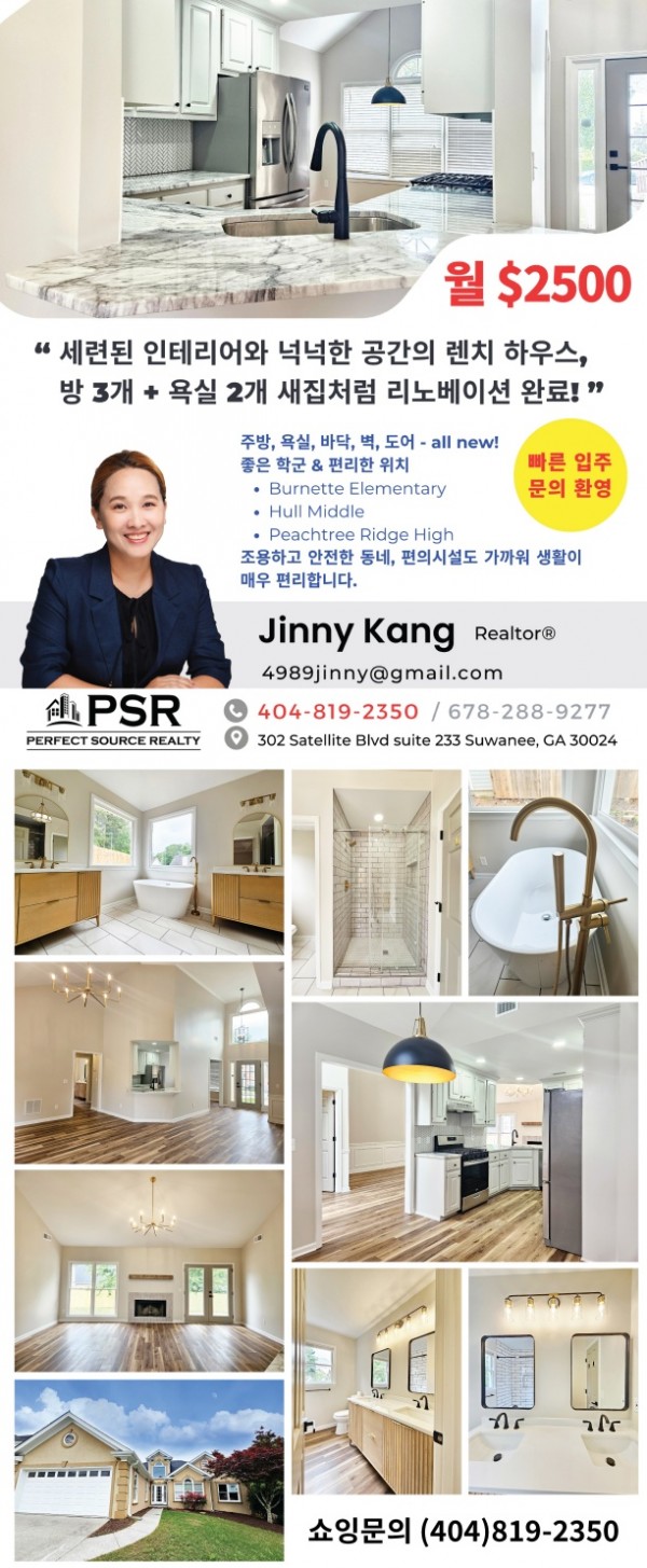 렌트 Suwanee / 레노베이션 완료, 방3+욕실2 / 렌치 하우스 (월 $2500)
