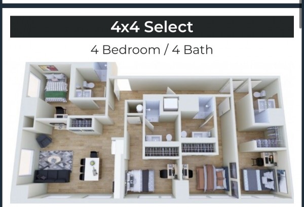 4 beds 4 baths중 방 하나이고 방 안에 화장실도 있습니다.