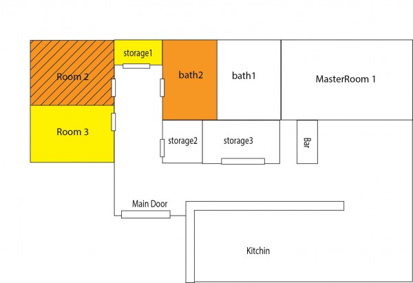 집안 내부에서 주황색 부분(Room2 + Bath 2)만 렌트합니다.
