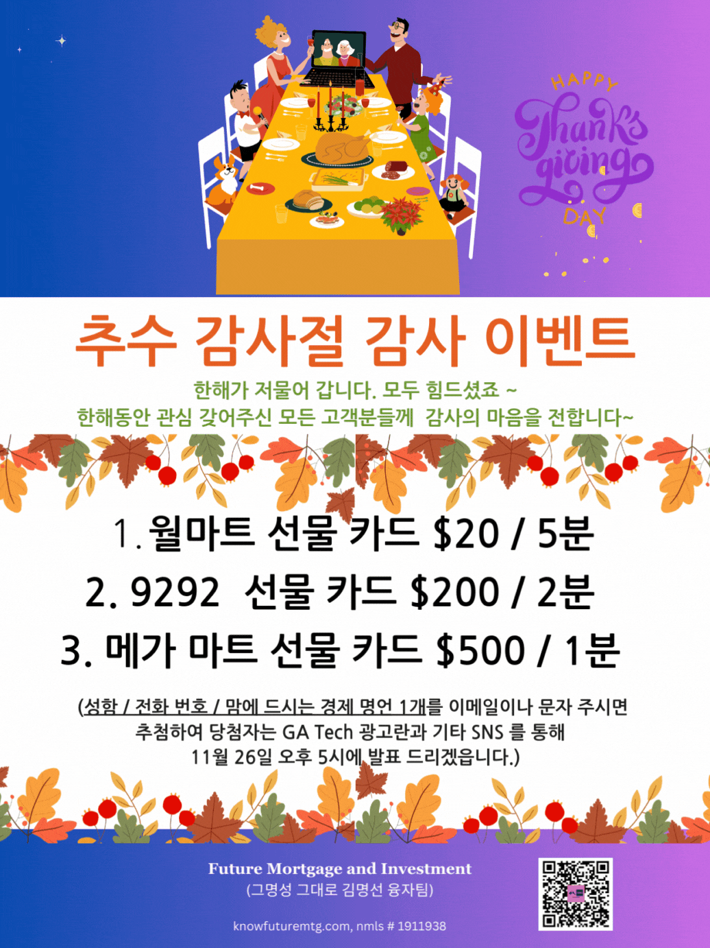 환기 사항: 융자나 기타 서비스를 요청하지 않으며 누구나 무료로 신청하실 수 있읍니다. 개인정보는 절대적으로 보호되며, 선물 증정 추첨목적으로만 사용됩니다. 추첨 등록 마감일: 11월 25일 오후 11시 59분 (동부 시간)