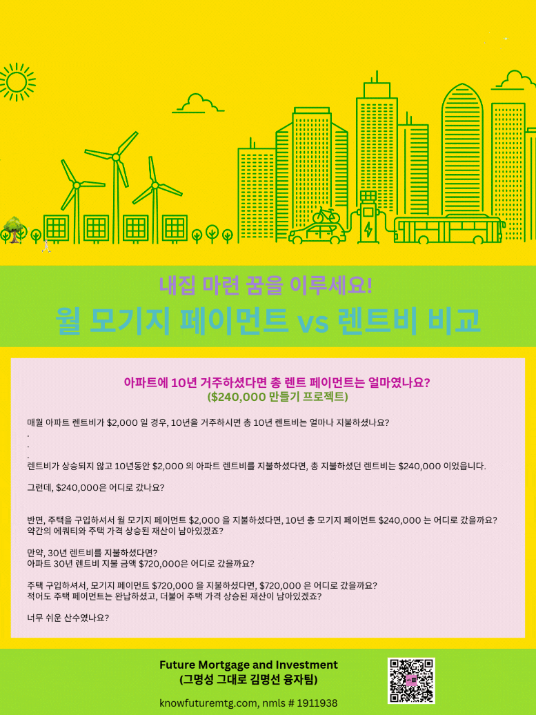 2. 인플레이션이 안되었다는 가정하에, 렌트비는 10년 $2,000의 경우, 물세와 전기세 별도의 경우 입니다. 주택의 모기지 페이먼트, $2,000은 원금, 이자, 재산세, 화재보험 포함된 페이먼트입니다. 물세와 전기세는 별도의 경우입니다. 개인 재산의 가치과 부흥을 인생 계획표에 갖고 계신 분들에 한합니다. 페인트등 주택 관리비용은 재산 관리 비용으로 매해 혹은 정기적인 관리가 필요합니다.
