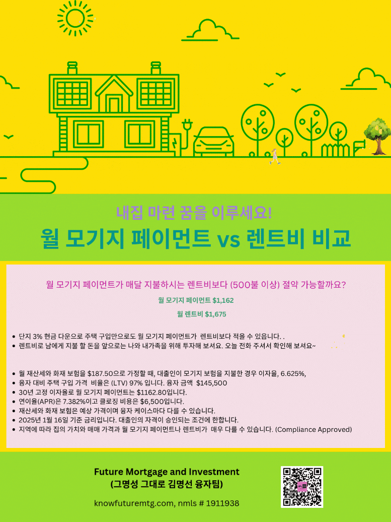 대출인의 자격이 승인되는 조건에 한합니다.지역에 따라 집의 가치와 매매 가격과 월 모기지 페이먼트나 렌트비가 매우 다를 수 있습니다. (Compliance Approved)