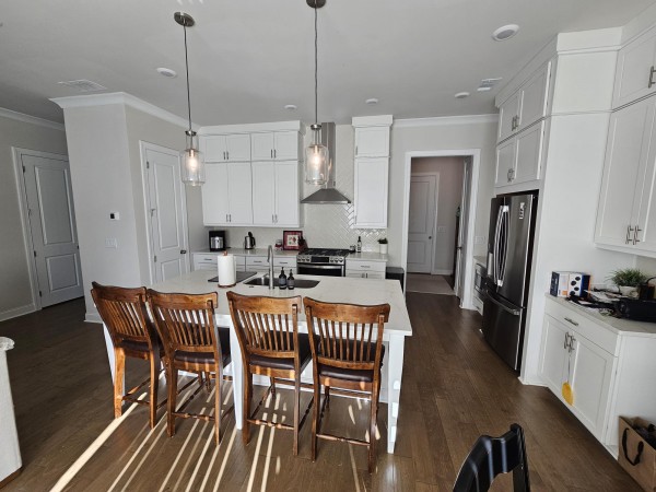 넓은 방 3개에 화장실 2.5개, 2차고 이구요 부엌에 흰색 캐비넷과 퀄츠 카운터탑의 아일랜드가 있구요 넓찍해서 요리가 즐거운 집입니다.
