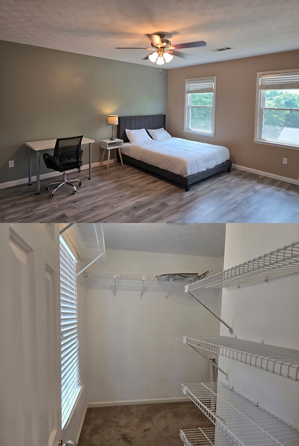 개인 Master Bedroom, 방안 개인 화장실 사용. Walk-in Closet. 기본 가구는 Queen사이즈 침대, 사이드 테이블, 책상 및 의자 비치해드립니다