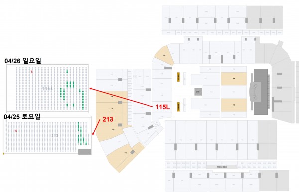 2. 좌석: 213섹션 36열 7,8 좌석 (4월 25일 토요일) / 115L섹션 19열 3,4 좌석 (4월 26일 일요일) - 정확한 위치는 사진 참고