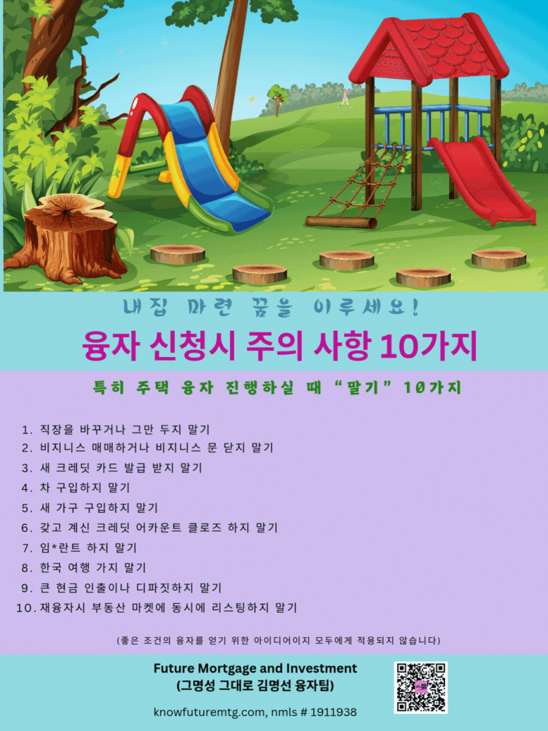 주의 사항: 융자는 돈 (신용)이고 돈 (신용) 은 빚입니다. 융자를 잘 활용하면 자산 증식이나 경제 생활에 큰 이익을 주지만, 그렇지 못할 경우, 집을 잃거나 경제적인 파국의 원인이 될수 있읍니다. 육체적인 고통이나 정신적인 고통은 911을 누르시고, 채무로 인한 경제적인 고통은 CFPB, Financial Counselor 혹은 가까운 융자 전문가에게 문의 하셔요.
