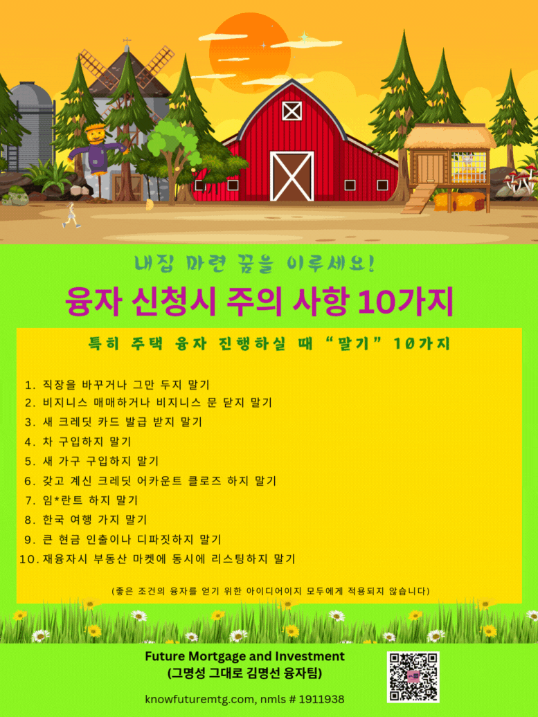 주의 사항: 융자는 돈 (신용)이고 돈 (신용) 은 빚입니다. 융자를 잘 활용하면 자산 증식이나 경제 생활에 큰 이익을 주지만, 그렇지 못할 경우, 집을 잃거나 경제적인 파국의 원인이 될수 있읍니다. 육체적인 고통이나 정신적인 고통은 911을 누르시고, 채무로 인한 경제적인 고통은 CFPB, Financial Counselor 혹은 가까운 융자 전문가에게 문의 하셔요.