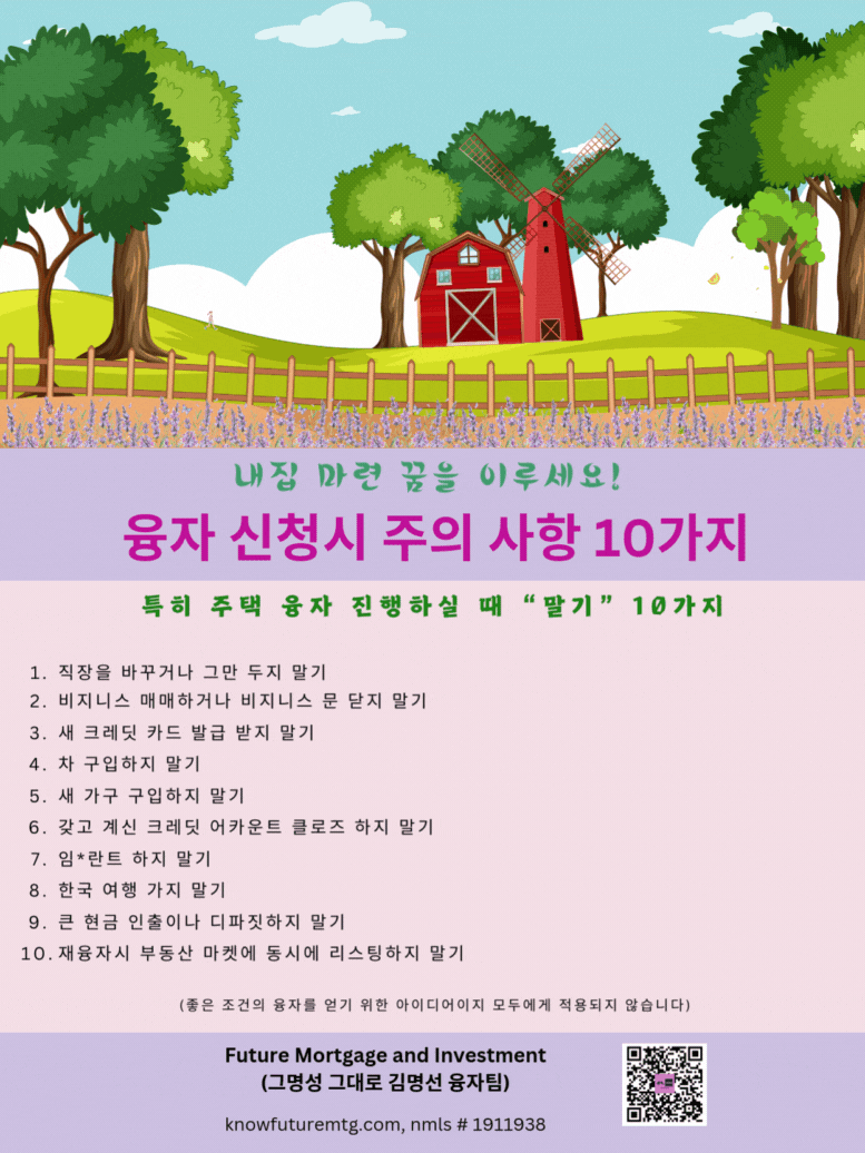 주의 사항: 융자는 돈 (신용)이고 돈 (신용) 은 빚입니다. 융자를 잘 활용하면 자산 증식이나 경제 생활에 큰 이익을 주지만, 그렇지 못할 경우, 집을 잃거나 경제적인 파국의 원인이 될수 있읍니다. 육체적인 고통이나 정신적인 고통은 911을 누르시고, 채무로 인한 경제적인 고통은 CFPB, Financial Counselor 혹은 가까운 융자 전문가에게 문의 하셔요.