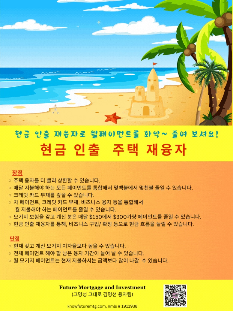 현금 인출 재융자로 월페이먼트를 화악 ~ 줄여 보셔요! ![]()