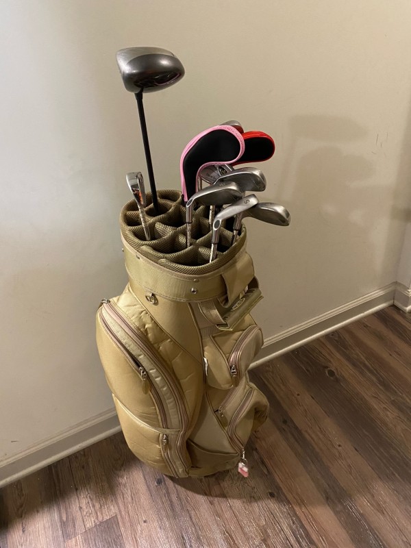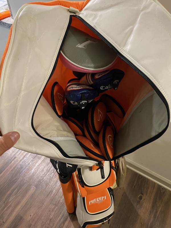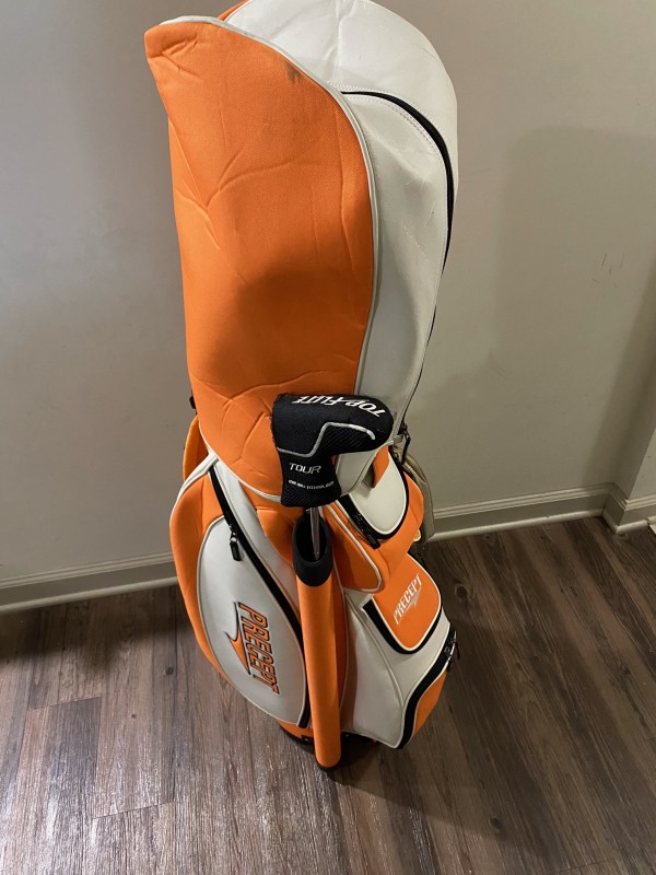 오렌지/흰색 골프백과 클럽 여자꺼는 200 불에 팝니다.(아이언세트+드라이브+퍼트)