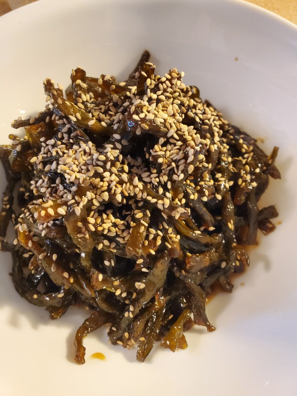 오전에 밭에서 막 따온 씸류, 부추등 싱싱한 채소가 있으며 맛있는 김치와 그린빈조림이 밥도둑이네요.