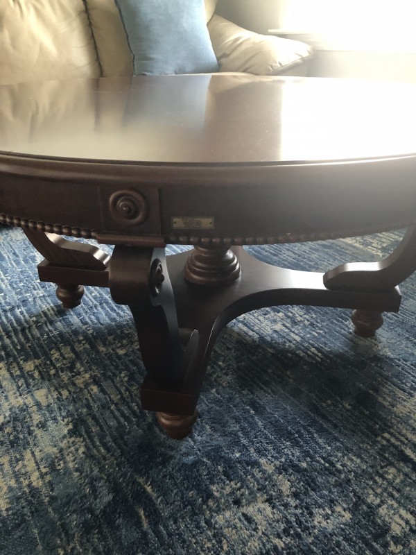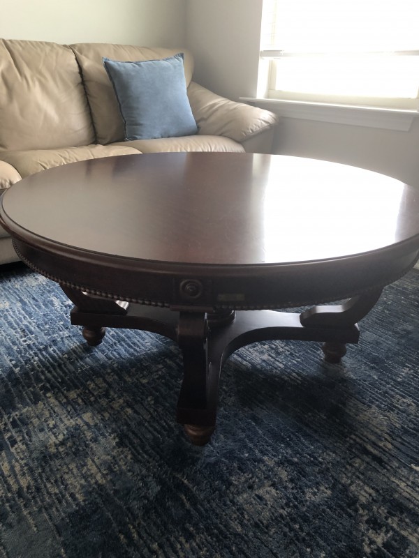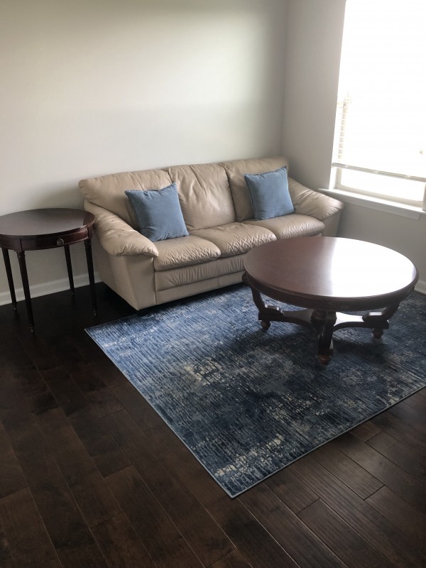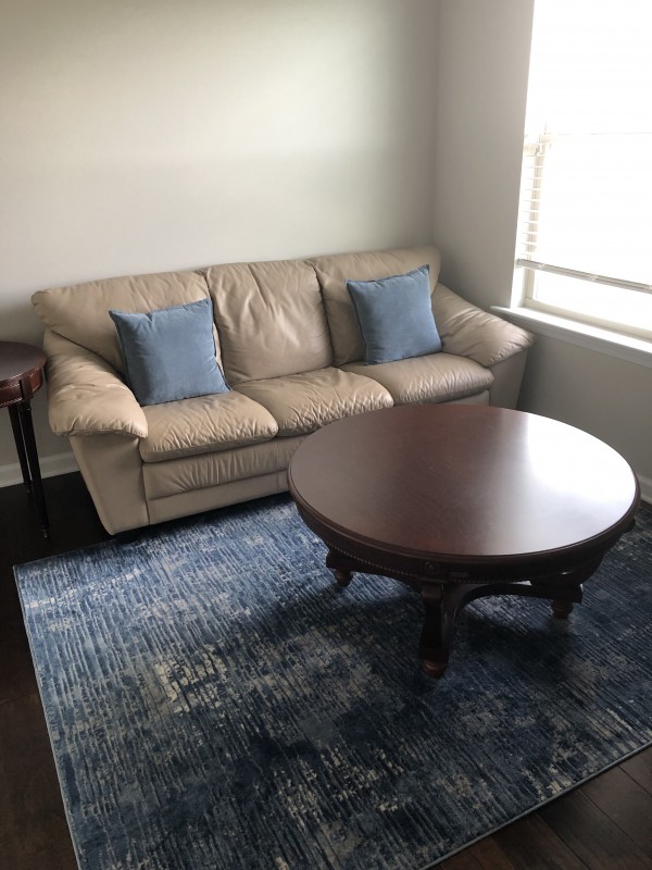 3인용 가죽소파와 원목으로만든 원형 테이블 두 개, 러그