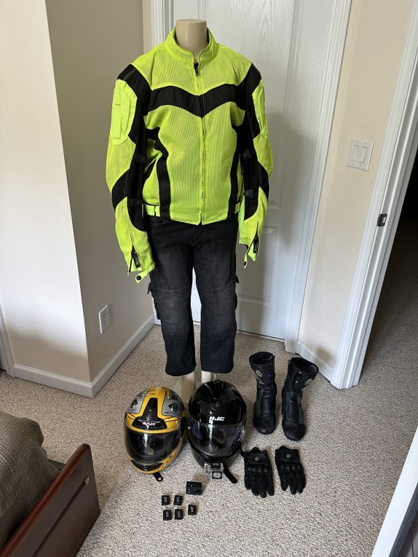 헬멧 2개, 옷, 글러브, 부츠 (size: 8.5), 오토바이 잭, 스페어 파트 엑세서리 포함.