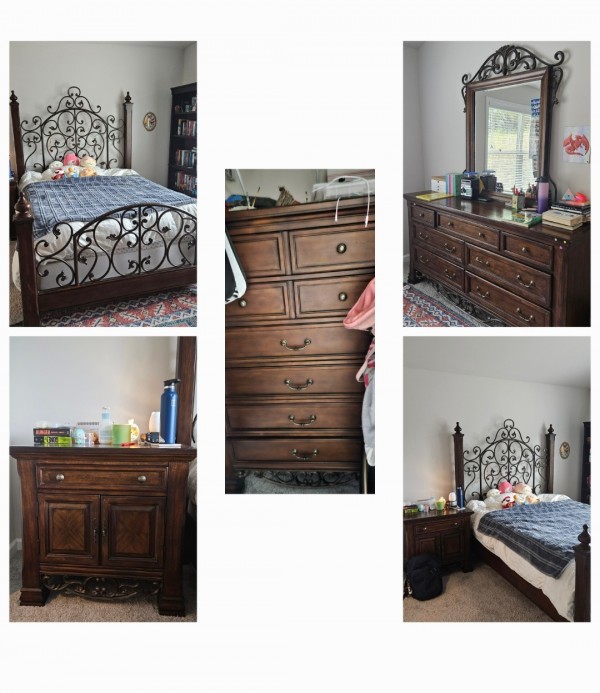 퀸싸이즈 베드 프레임 (메모리폼 메트리스도 포함), 5단 서랍장, 3단 서랍장, 나잇스탠드 서랍 2개,