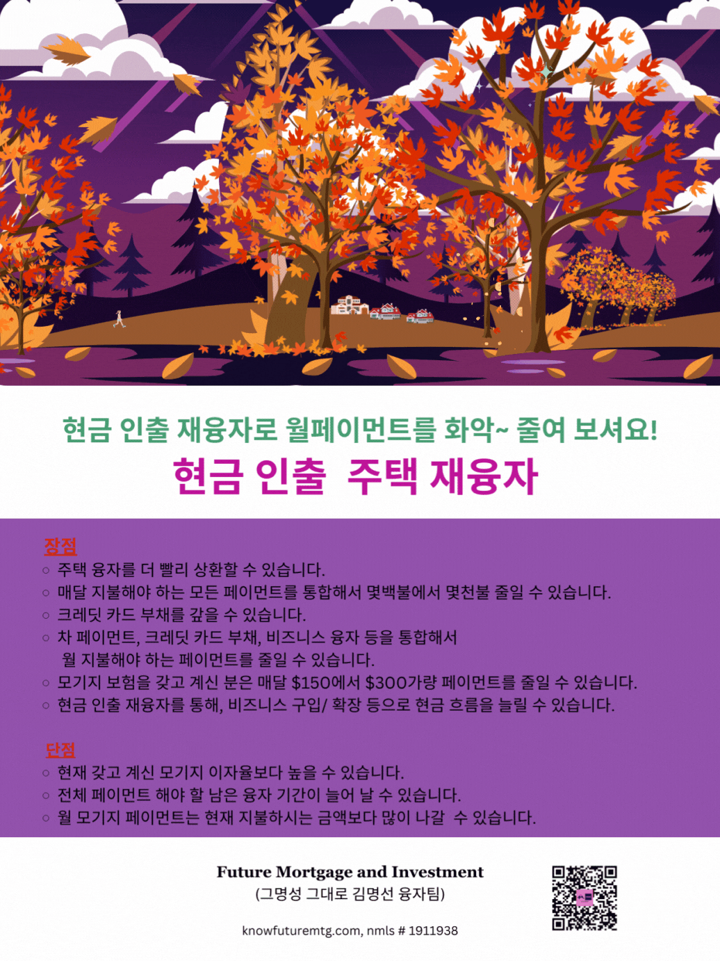 현금 인출 재융자로 월페이먼트를 화악 ~ 줄여 보셔요!