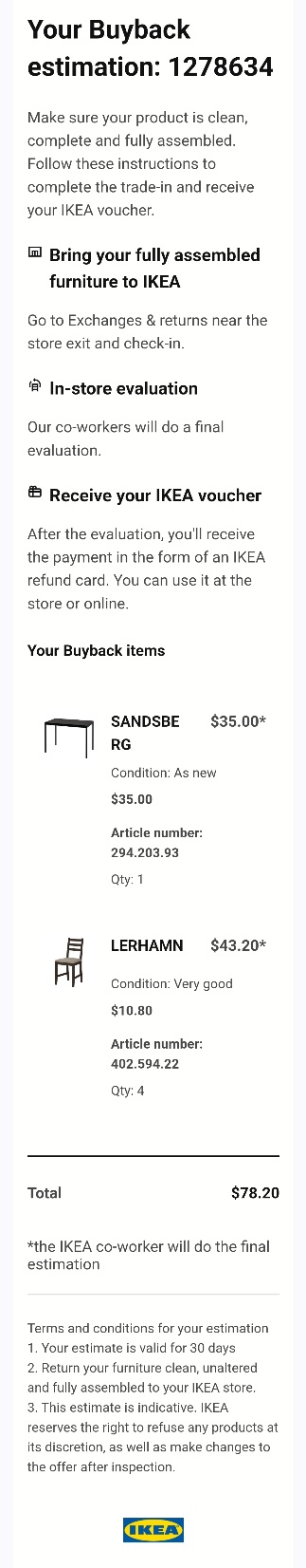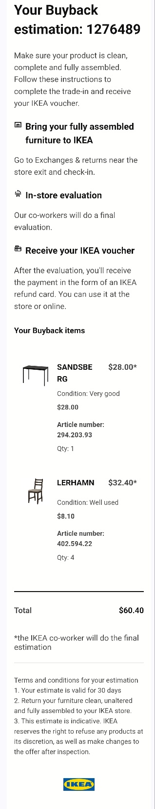 현재 ikea 매장에 가서 중고 가격으로 60.4(상태 보통)~78(상태 상)불에 되팔수 있습니다.( 바이백 견적서 참고) 사용하시다가 ikea에 되파시면 추가금 없이 무료나 추가금 받고 사용도 가능합니다.