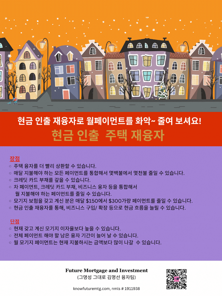 현금 인출 재융자로 월페이먼트를 화악 ~ 줄여 보셔요!