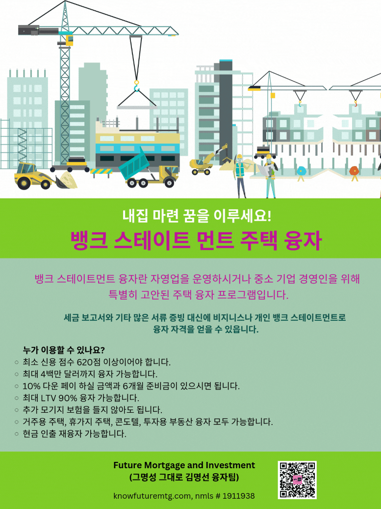 주의 사항: 융자는 돈 (신용)이고 돈 (신용) 은 빚입니다. 융자를 잘 활용하면 자산 증식이나 경제 생활에 큰 이익을 주지만, 그렇지 못할 경우, 집을 잃거나 경제적인 파국의 원인이 될수 있읍니다. 육체적인 고통이나 정신적인 고통은 911을 누르시고, 채무로 인한 경제적인 고통은 CFPB, Financial Counselor 혹은 가까운 융자 전문가에게 문의 하셔요.