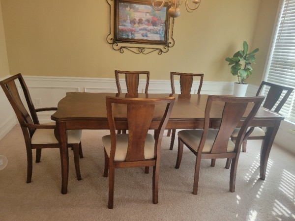상태 좋은 다이닝셋트 팝니다. 거의 쓰지 않아서 깨끗합니다. 팔걸이 있는 의자 2개 포함해서 6개의 의자와 줄일 수도 있고 크게 사용하실 수도 있는 테이블 함께 셋트로 팝니다. 가격은 $350 이고 404-406-8835 로 문자 주세요. 감사합니다.