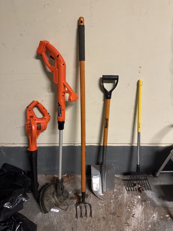 3. 홈디포에서 구매한 삽, 낙엽쓸기 등.