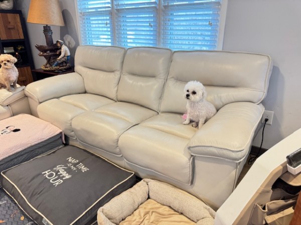 연회색 가죽 소파를 $700 판매합니다. 매우 편안하고 깨끗하며 잘 관리되어 있습니다. 얼룩이나 찢어진 부분은 없습니다.