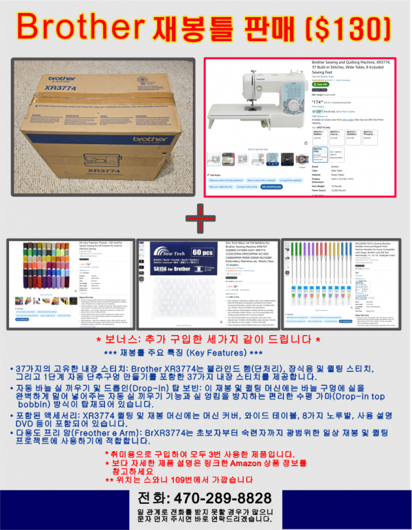 ** Brother 재봉틀 팝니다 [상태 최상: $130 재봉틀과 추가 구입 물품 포함] ** > 중고장터