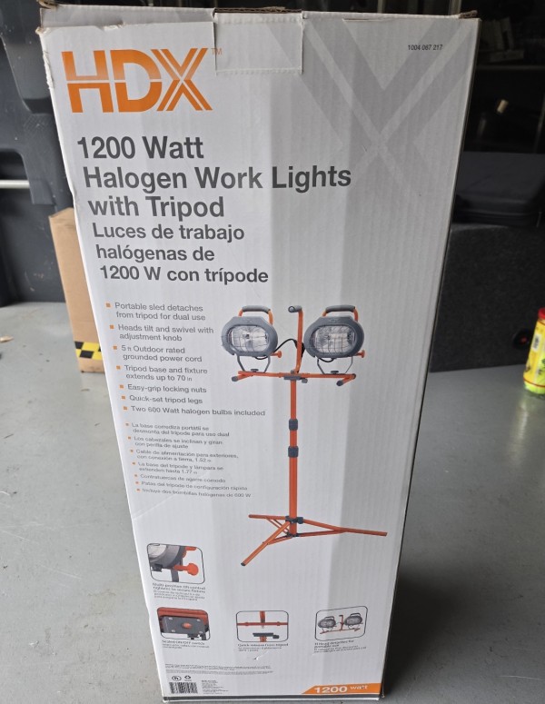 • 설명: 아주 밝은 1200W 할로겐 작업등입니다. 삼각대 높이 조절 가능하고, 조명 부분만 따로 분리해서 바닥에 세워 쓸 수도 있어 편리합니다. 야간 작업이나 창고, 차고에서 쓰기 좋습니다.