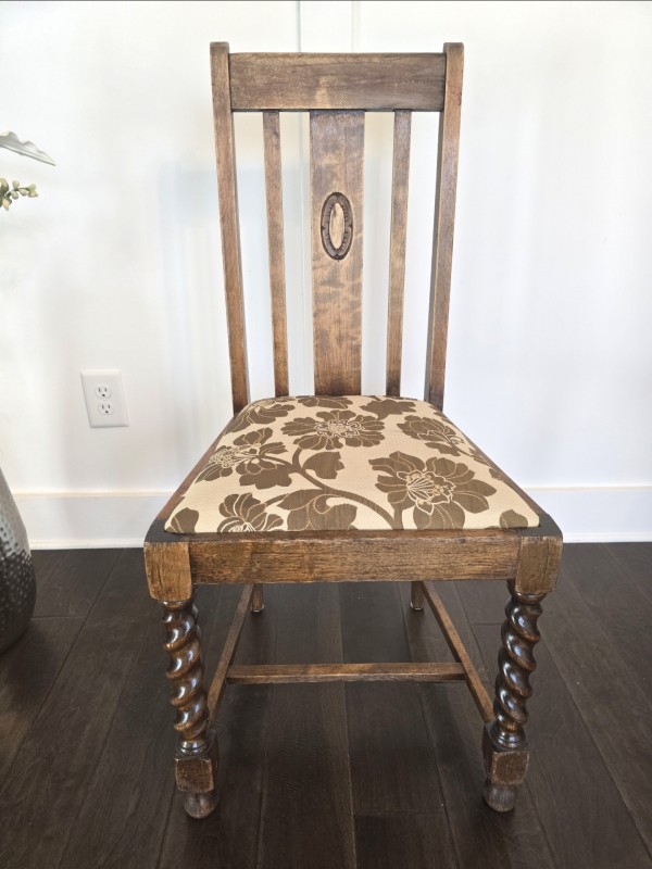 • 앤티크 스타일 우드 체어 ($20): 고풍스러운 다리 디자인과 패턴 시트가 특징인 튼튼하고 우아한 의자입니다.