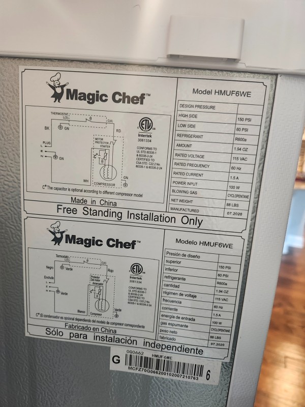 Type: Upright freezer Capacity: 5.8 cu. ft. Voltage: 115V Manual defrost Slim design (good for garage or small space)