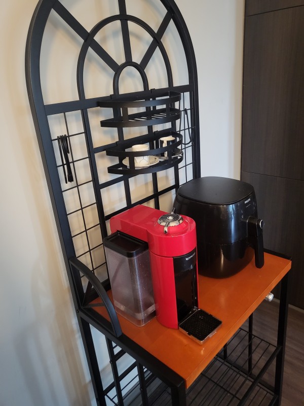 A5: (like new)metal/wood arch frame shelf stand $50